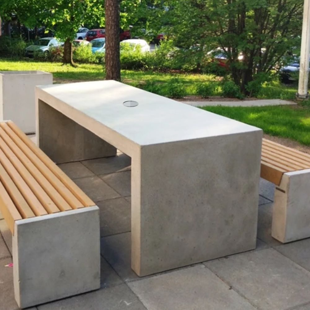 Betona galds ar iespēju vidū ievietot saulessargu (pieejams arī modelis bez saulessarga cauruma). Izmēri: garums 2000mm, augstums 750mm, platums 800mm. Svars: 720kg.