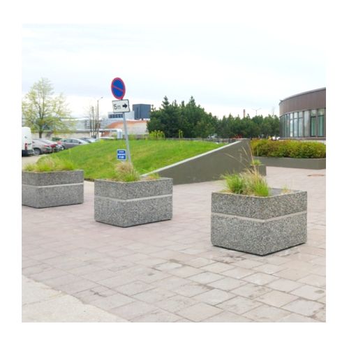 Betona puķu pods (kvadrātveida) ar nerūsējošā tērauda joslu. Izmēri: garums 900mm, platums 900mm, augstums 700mm. Svars: 440kg. Iespējamie betona toņi: P101, P103, P104, P106, S101, S103, S104, S205.