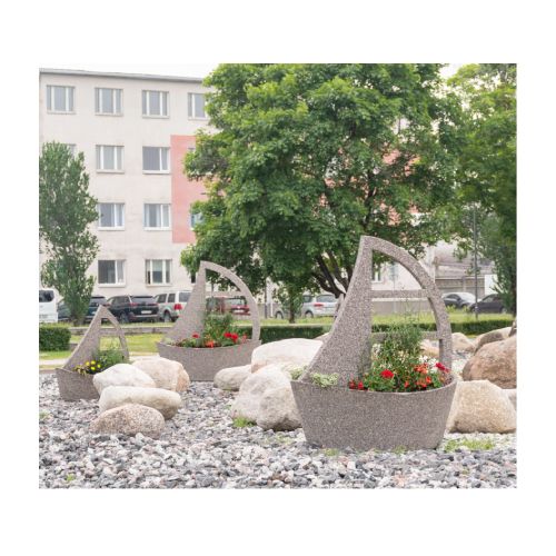 Betona puķu pods (laivas tipa ar buru). Izmēri: garums 1650mm, platums 1160mm, kopējais augstums 1820mm. Svars: 600kg. Pieejamie betona toņi: P101, P103, P104, P106, P107, P108, P109, P201, P202, P203, P301, P303, P410, P412, P414.