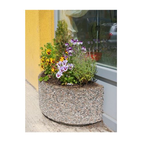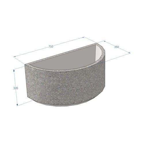 Betona puķu pods (pusapļa). Izmēri: garums 710mm, platums 350mm, augstums 320mm. Svars: 58kg. Iespējamie betona toņi: P101, P102, P103, P104, P106, P107, P108, P109, P201, P202, P203, P301, P303, P410, P412, P414.