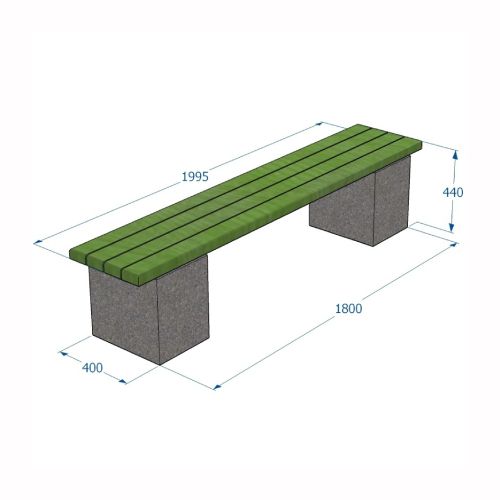 Betona soliņš ar koka dēlīšiem. Izmēri: garums 2000mm, platums 400mm, augstums 440mm. Svars: 250kg. Apdares metode: mazgāts betons. Iespējamie betona toņi: P101, P103, P106. Iespējamie koka dēlīšu toņi: 5050, 5053, 5055, 5059, 5061, 5066, 5068, 5071, 5072, 5075, 5076, 5077, 5085, 5086, 5089.
