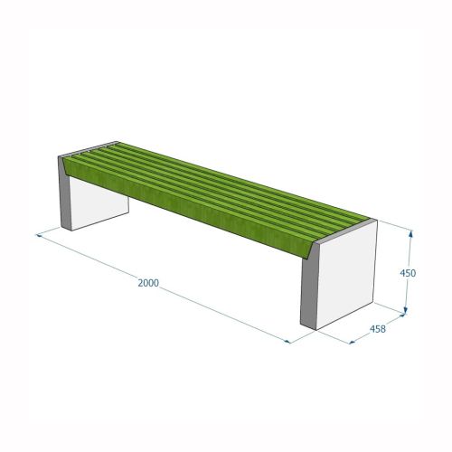 Betona soliņš ar koka dēlīšiem. Izmēri: garums 2000mm, platums 458mm, augstums 450mm. Svars: 115kg. Iespējamie gludā betona toņi: S101, S103, S104. Iespējamie koka dēlīšu toņi: 5050, 5053, 5055, 5059, 5061, 5066, 5068, 5071, 5072, 5075, 5076, 5077, 5085, 5086, 5089.
