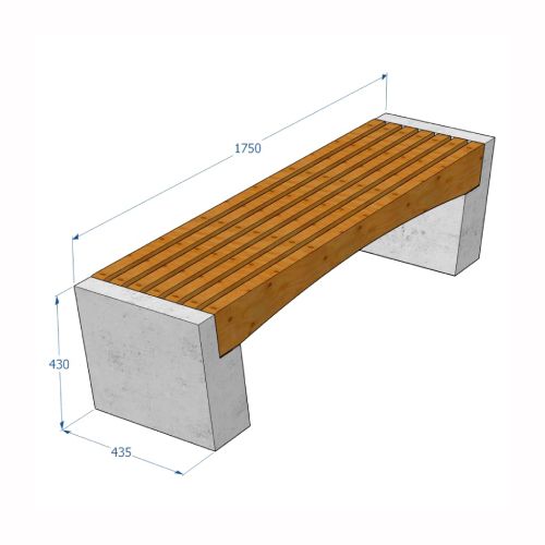 Betona soliņš (tilta formas). Izmēri: garums 1750mm, platums 435mm, augstums 430mm. Svars: 170kg. Iespējamie betona toņi: S101, S102, S103, S104, S201, S202, S203, S204, S205. Iespējamie koka dēlīšu toņi: 5050, 5053, 5055, 5059, 5061, 5066, 5068, 5071, 5072, 5075, 5076, 5077, 5085, 5086, 5089.