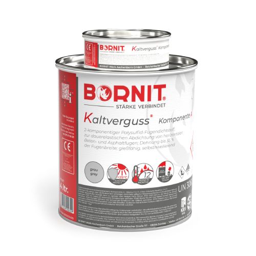 BORNIT® Kaltverguss auksti lejamā masa. Krāsa: pelēka. Iepakojums: 4l bundža. Divkomponentu produkts, paredzēts šuvju hermetizēšanai. Izgatavota uz polisulfīda bāzes. Ilgi saglabā elastību. Var liet, sadalās un izlīdzinās pati. Lej aukstu. Paredzēta horizontālu betona vai asfalta šuvju hermetizēšanai, veicot pazemes un virszemes būvdarbus, kā arī klājot ceļus. Var izmantot arī, hermetizējot šuves saskaņā ar DIN 18540-F, kad šuves stiepšanās sasniedz līdz 25 % no šuves platuma. Piemērots asfalta un betona šuvju hermetizēšanai. Produkts ir izturīgs pret vielām, no kurām sastāv automašīnu degviela. Virsma gruntējama atkarībā no lietošanas gadījuma. Gruntējama ar BORNIT® sākotnējo betona grunti (BORNIT® Betonprimer) vai BORNIT® sākotnējo asfalta grunti (BORNIT® Asphaltprimer). Patēriņš atkarīgs no šuves lieluma.