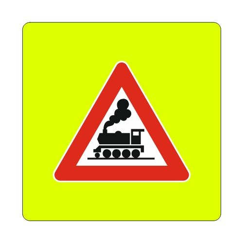 Brīdinājuma zīme Nr.133F/Dzelzceļa pārbrauktuve bez barjeras. Ar fluorescējošu rāmi apkārt. Izmēri: 940x940mm. 2. atstarošanas klase.