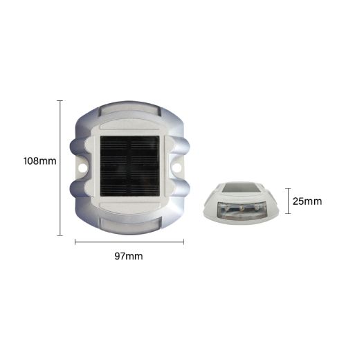Ceļa atstarotājs, kas aprīkots ar LED diodēm un saules baterijām. Krāsa: balta. Izmēri: garums 108mm, platums 97mm, augstums 25mm. Saules panelis: 2.5V/120mAh. Akumulators: 1.2V/600mAh (NI-Mh baterija). Darba režīmi: mirgojošs vai pastāvīgs. Aprīkota ar 6gab. ļoti gaišām LED diodēm (d=5mm). Redzes diapazons: vairāk kā 800m. Gaismas intensitāte: 400-500lx. Darba temperatūra: -20 līdz +80 grādi pēc Celsija. Ūdensizturības klase: IP68. Darbības ilgums: vairāk kā 200h mirgojošajam režīmam/72h pastāvīgajam režīmam. Darbības ilgums: 3-5 gadi. Saspiešanas pretestība: >20T. Materiāls: polikarbonāts (PC) un alumīnijs. Stiprināms asfaltā vai betonā ar 2 skrūvēm vai pielīmējams ar speciālu līmi.