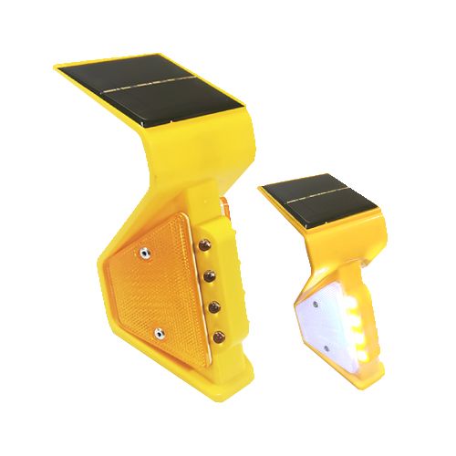 Ceļa barjeru atstarotājs (montējams barjerā, abpusējs). Aprīkots ar solāro (saules) paneli un 4 LED diodēm katrā atstarotāja pusē (kopā 8 LED diodes, diodes d=8mm). Solārais panelis: 3V, 180mA. Krēslā/tumsā mirgoši LED vai vienmērīga gaisma. Atstarotāja krāsa: balta. Materiāls: plastmasa un akrils. Izmēri: garums 95mm, platums 95mm, augstums 260mm. Pielieto piestiprināšani ceļu norobežošanas barjerās u.c. Pieejamie veidi: abpusēji dzeltens, abpusēji balts vai cits individuāls veids pēc pasūtījuma. Svars: 0.37kg.