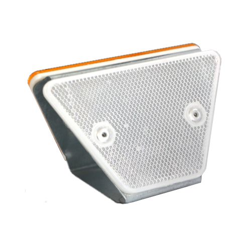 Ceļa barjeru atstarotājs (montējams barjerā, abpusējs). Krāsa: balta-oranža. Materiāls: tērauda stiprinājums un polimēru materiāla (PMMA). Izmēri: garums 121mm, platums 70.5mm, augstums 50/65mm. Stiprinājums biezums: 1.5mm. Pielieto piestiprināšani ceļu norobežošanas barjerās u.c. Ūdens un saules izturīgs. Pieejamie veidi: abpusēji dzeltens, abpusēji sarkans un balts-dzeltens katrā pusē vai cits individuāls veids pēc pasūtījuma. Kastē: 100gab. Cena par gab.!