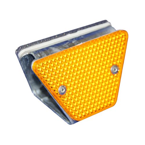 Ceļa barjeru atstarotājs (montējams barjerā, abpusējs). Krāsa: dzeltena. Materiāls: tērauda stiprinājums un polimēru materiāla (PMMA). Izmēri: garums 121mm, platums 70.5mm, augstums 50/65mm. Stiprinājums biezums: 1.5mm. Pielieto piestiprināšani ceļu norobežošanas barjerās u.c. Ūdens un saules izturīgs. Pieejamie veidi: abpusēji dzeltens, abpusēji sarkans un balts-dzeltens katrā pusē vai cits individuāls veids pēc pasūtījuma. Kastē: 100gab. Cena par gab.!
