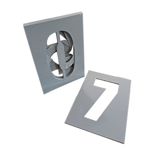 Ciparu trafaretu komplekts (0-9). Izgatavots no stiklašķiedras. Stiklašķiedras biezums: 3mm. Izmēri: ārējais 210x300mm, ciparu augstums 200mm.