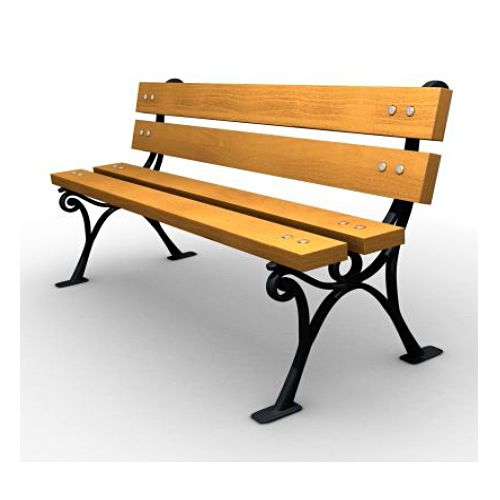 Čuguna soliņš ar koka dēlīšiem un atzveltni (soliņš brīvi stāvošs). Garums: 100cm, sēdekļa dziļums 25cm, sēdekļa augstums 31cm, kopējais augstums 55cm. Priedes koka dēļi, melni krāsots čuguna karkass. Dēlīši iespējami tīkkoka (gaiša koka) vai rožkoka – palisandra (tumša koka) toņos.