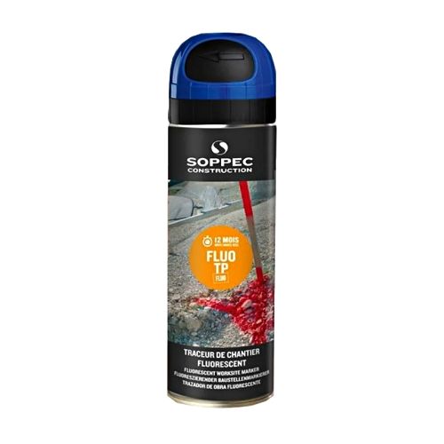 FLUO TP luminiscējoša krāsa marķēšanai (aerosols), zila, 500ml. Kastē 12gab. Ūdensizturīga, piemērota arī uz mitrām virsmām. Ātri žūstoša (~10min.). 12 mēnešu noturība. Piemērota marķēšanai uz betona, asfalta, zāles, grants, akmens, kokiem u.c. Liels fluorescējošo pigmentu blīvums, tāpēc ļoti labi pamanāma. Izmantojama temperatūrā no -20 līdz + 50 grādiem pēc Celsija. Ar 1 aerosola baloniņu var noklāt ~80m (2cm platumā). Var pūst ar rokas pistoli un pistoli uz 1 riteņa.