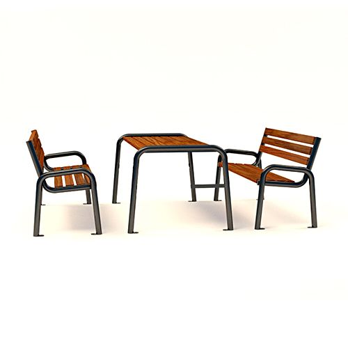 Komplektā divi soliņi un galds.