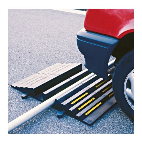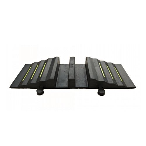 Gumijas cauruļu, šļūteņu aizsargs (HR-3). Izmēri: 855x300x85mm. Materiāls: cietā kaučuka savienojums. Krāsa: melna ar dzeltenām atstarojošām līnijām. 2x92mm kanāli (šļūtenēm līdz d=75mm). Svars: 13kg.