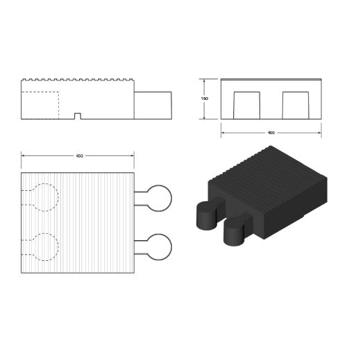 Gumijas kabeļu un šļūteņu aizsargs (rampa). Izmēri: 450x400x160mm. Piemērots caurulēm no d=140-180mm. Krāsa: melna. Maksimālais ass svars: 12t. Nav piemērots kāpurķēžu transportlīdzekļiem. Svars: 33kg.