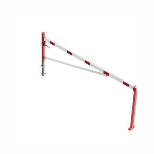 ar tapu, bloķēšana 4 pozīcijās (ik pēc 90 grādiem). Betonējama (ieteicamie betona pamata izmēri galvenajam vertikālajam stabam 550x550x900mm; atbalsta stabam – 400x400x900mm). Pieejams arī modelis, kur barjera stiprināma pie pamatnes (pēc pieprasījuma). Izmēri: horizontālās barjeras garums 3500mm, vertikālais stabs (karsti cinkots un krāsots sarkans) d=102mm, vertikālais atbalsta stabs 400x400x900mm, horizontālā barjera (alumīnija caurule) 100x50mm – balta ar sarkanām atstarojošām joslām, augstums virs zemes 950mm. Karsti cinkota ar baltu korpusu un sarkanām joslām. Svars: 60kg.