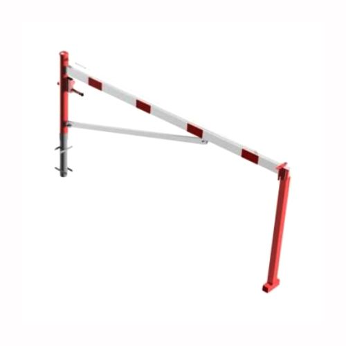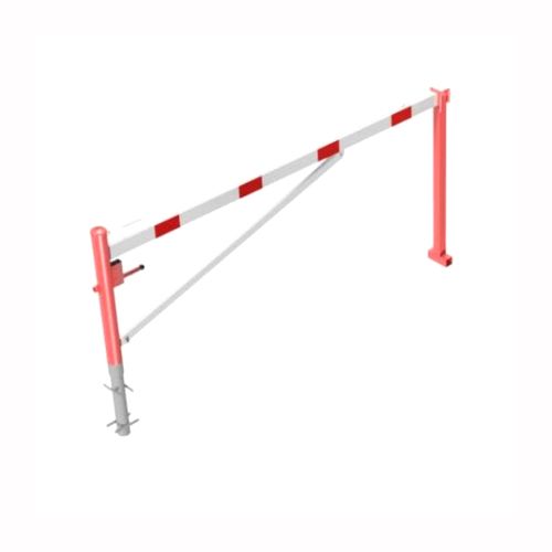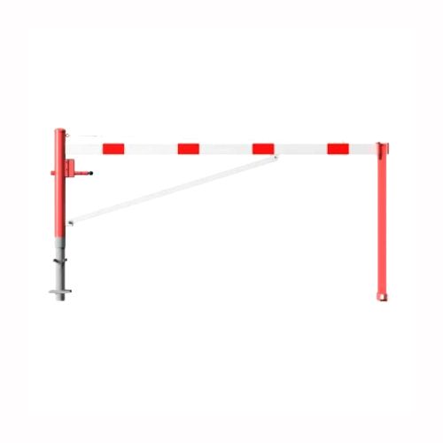 ar tapu, bloķēšana 4 pozīcijās (ik pēc 90 grādiem). Betonējama (ieteicamie betona pamata izmēri galvenajam vertikālajam stabam 550x550x900mm; atbalsta stabam – 400x400x900mm). Pieejams arī modelis, kur barjera stiprināma pie pamatnes (pēc pieprasījuma). Izmēri: horizontālās barjeras garums 3000mm, vertikālais stabs (karsti cinkots un krāsots sarkans) d=102mm, vertikālais atbalsta stabs 400x400x900mm, horizontālā barjera (alumīnija caurule) 100x50mm – balta ar sarkanām atstarojošām joslām, augstums virs zemes 950mm. Karsti cinkota ar baltu korpusu un sarkanām joslām. Svars: 58kg.