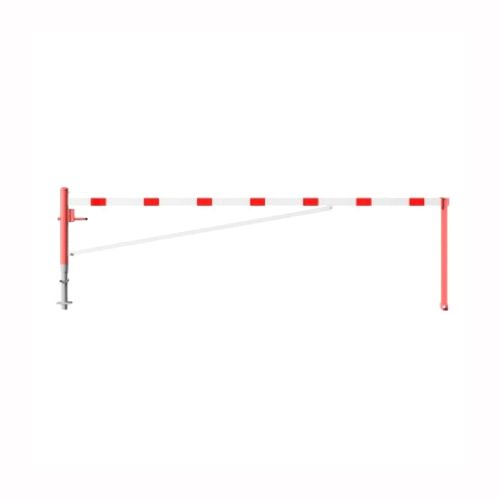 ar tapu, bloķēšana 4 pozīcijās (ik pēc 90 grādiem). Betonējama (ieteicamie betona pamata izmēri galvenajam vertikālajam stabam 550x550x900mm; atbalsta stabam – 400x400x900mm). Pieejams arī modelis, kur barjera stiprināma pie pamatnes (pēc pieprasījuma). Izmēri: horizontālās barjeras garums 5000mm, vertikālais stabs (karsti cinkots un krāsots sarkans) d=102mm, vertikālais atbalsta stabs 400x400x900mm, horizontālā barjera (alumīnija caurule) 100x50mm – balta ar sarkanām atstarojošām joslām, augstums virs zemes 950mm. Karsti cinkota ar baltu korpusu un sarkanām joslām. Svars: 66kg.