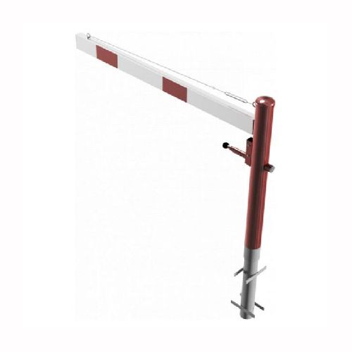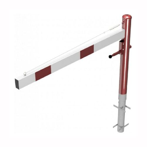 ar tapu, bloķēšana 4 pozīcijās (ik pēc 90 grādiem). Betonējama (ieteicamie betona pamata izmēri 550x550x900mm). Pieejams arī modelis, kur barjera stiprināma pie pamatnes (pēc pieprasījuma). Izmēri: horizontālās barjeras garums 1500mm, vertikālais stabs (karsti cinkots un krāsots sarkans) d=102mm, horizontālā barjera (alumīnija caurule) 100x50mm – balta ar sarkanām atstarojošām joslām, augstums virs zemes 950mm. Karsti cinkota ar baltu korpusu un sarkanām joslām. Svars: 32kg.
