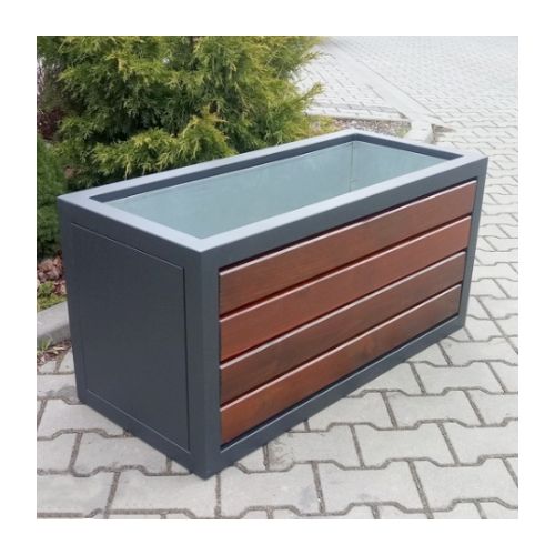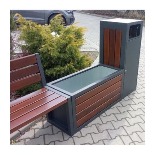 Komplekts ar soliņu, 2 puķu podiem un 2 atkritumu tvertnēm. Izmēri: kopējais garums: 5380mm, dziļums 440mm. Cinkots/krāsots puķu pods un soliņš ar koka dēlīšiem. Materiāls: cinkots un krāsots tērauds (pieejama arī nerūsējošā tērauda versija), skujkoka dēlīši (tonis gaišs ozols vai palisandrs (tumšs). Metāla detaļas krāsotas RAL tonī (pieejamie toņi: melna RAL 9005; grafīta pelēka RAL 7021; sudraba pelēka RAL 9006; pelēka RAL 9007; brūna RAL 8011; dzeltena RAL 1023; zaļa RAL 6018; sarkana RAL 3002; oranža RAL 2000). Izmantojams gan ārā, gan iekštelpās.