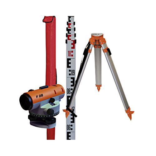 Komplekts – automātiskais optiskais nivelieris NEDO F28, 5m mērlata un alumīnija statīvs ar plakanu virsmu.