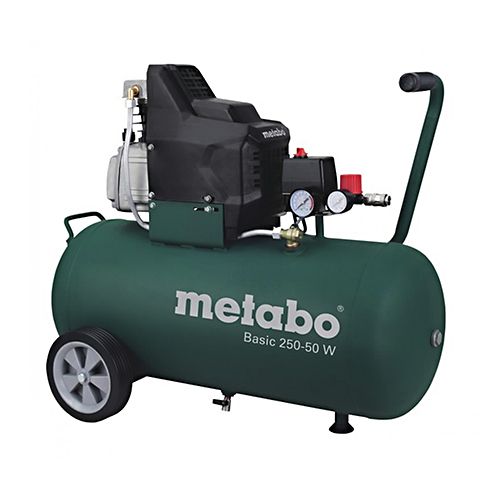 Kompresors METABO Basic 250-50 W. Uzsūkšanas jauda: 200 l/min., uzpildes tilpums: 110l/min., efektīvais atdeves apjoms (ja darba spiediens ir 7,2 bāri): 95l/min., maksimālais spiediens: 8 bāri, nominālā ieejas jauda: 1,5kW, maksimālais ātrums: 2850 / min., tvertnes tilpums: 50l. Izmēri: 830x445x715mm. Svars: 32kg.