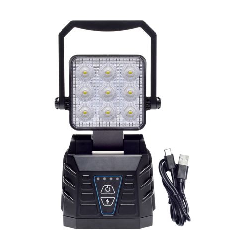 LED darba lukturis uz magnēta pamatnes. Jauda: 27W (9 LED x 3W). Lādējams (C tipa USB kabelis). Spriegums: 12-24V. Stiprināšana ar magnētu. Darbības laiks: 3-4 stundas. IP66 mitruma klase. Temperatūras diapazons no -30°C līdz +50°C. Ieslēgšanas/izslēgšanas un zibspuldzes režīma izvēle. Ar 4h pilnu uzlādi nodrošina 6h darbību. Izturīgs alumīnija korpuss. Var grozīt lampas leņķi.