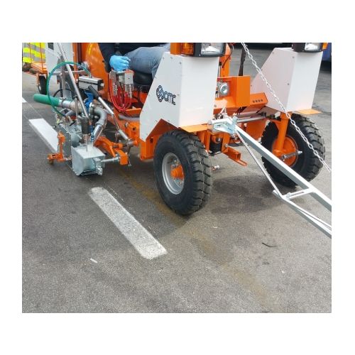Līniju krāsošanas ierīce 2-komponentu aukstajam plastikātam 250C-ST (turbo dīzeļa dzinējs). Ideāli piemērota darbiem, kur nepieciešama liela aukstā plastikāta tvertnes ietilpība, ierīce uz 4 riteņiem ar sēdošu operatoru, precizitāte un stabilitāte. Pielietojama aukstā materiāla izstrādei. Spiediena tvertne aukstajam plastikātam: tilpums 250l (250C-ST) – 400l (400C-ST), izgatavots no nerūsējošā tērauda, ar hidraulisko maisītāju. Gravitācijas tvertne pulvera katalizatoram: tilpums 22l. Ar elektrisko dozēšanas ierīci, elektroniski regulējams. Spiediena stikla pērlīšu tvertne, tilpums 100l (250C-ST) – 170l (400C-ST). Ar spiediena regulatoru un mitruma separatoru. Kompresors: zems gaisa ātrums 827l/min. Automātiska stikla lodīšu pistole ar gaisa sadales sistēmu. Difuzors ar regulējamu slīpumu un regulējamiem atvēršanas leņķiem. Aizvēršanas aizkaves regulators lodīšu pistolei. Maksimālais līnija platums: 30cm (sasniedzams tikai ar atbilstošu papildu aprīkojumu). Komplekts aglomerāta līnijai, kas sastāv no: veltņa ar maināmi zobiem, veltņa turētāja ar hidraulisko motoru, 2 prioritārajiem vārstiem, kas padara veltņa un maisītāja ātrumu neatkarīgu no dzinēja apgriezienu skaita. Elektroniskā distancēšanas ierīce C8000 + programma profila līnijai: 8 saglabājamas programmas, trauksme, ja ātrums ir ārpus iestatītā minimālā/maksimālā ātruma diapazona: kopējie nepārtrauktās līnijas metri, kopējie dati par mašīnu: kopējais nobrauktais km; profila programma: iestata katras joslas garumu un attālumu starp 2 stieņiem. Turbo dīzeļdzinējs: jauda 44ZS, šķidruma dzesēšana. Darba gaismas un LED bāka. Brīdinājuma panelis ar bultu automašīnas apdzīšanai pa kreisi/pa labi un 2 mirgojoši režīmi. Hidrauliskā piedziņa ar: 2 motoriem, kas tieši savienoti uz aizmugurējiem riteņiem, hidrauliskām negatīvām bremzēm, uz priekšu, atpakaļgaitā un neitrālā pārnesuma vadību ar negatīvo bremžu iedarbināšanu, mainīgas plūsmas sūkņi. Stūre uz priekšējiem riteņiem. Stūres diametrs 7,35m (250C-ST). Sēdeklis ar regulējamu pozīciju (pa kreisi/pa labi; uz priekšu/aizmuguri). Saulessarga jumts. Fotoattēls neatspoguļo standarta versiju.
