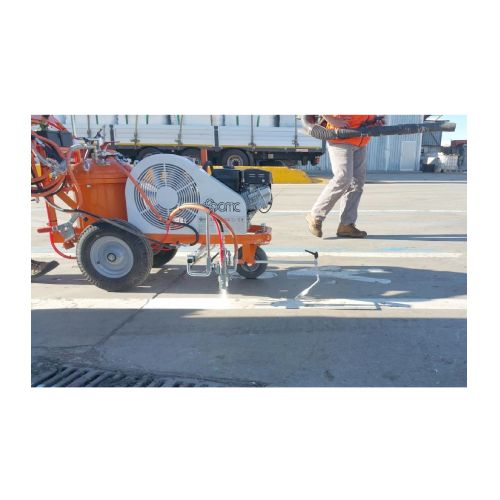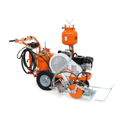 Līniju krāsošanas ierīce L40-PRO (maziem laukumiem). Atstarojošām krāsām ar iepriekš sajauktām stikla lodītēm, pretslīdes krāsām, nelieliem ceļu uzturēšanas darbiem, autostāvvietām, sporta laukumiem, veloceliņiem. IDEĀLI PIEMĒROTI: maziem ceļu uzturēšanas darbiem, autostāvvietām, sporta laukumiem, veloceliņiem. KRĀSAS LIETOŠANA: refrakcijas (ar iepriekš sajauktām stikla lodītēm), nerefrakcijas, speciālas krāsas ar augstu pretslīdes saturu. Spiediena krāsas tvertne: ietilpība 40l, ar manuālu maisītāju un pilnībā noņemamu vāku vieglākai un ātrākai tīrīšanai. Šķīdinātāja tvertne pistoles un krāsas šļūtenes skalošanai. Kompresors: gaisa plūsmas ātrums 394 l/min. Automātiska krāsošanas pistole ar līnijas ierobežotāju (apvalku), uzstādīta uz fiksēta balsta ar regulējamu pistoles augstumu. (Fiksēto balstu var aizstāt ar pneimatisko balstu vai ar marķēšanas diskiem). Standarta sprausla 10-20 cm līnijai. MAX. LĪNIJAS PLATUMS: 30cm. (var sasniegt tikai ar atbilstošu papildu aprīkojumu). Benzīna dzinējs: jauda 6 ZS, paštinuma vilkšanas starts. Rokas stumšana. (Ir iespējams aprīkot līniju marķēšanas iekārtu ar hidrauliskajiem motorizētajiem ratiņiem). Grozāms priekšējais ritenis. Darba laikā to var aizslēgt vai atbloķēt ar sviru uz stūres.