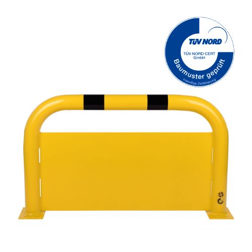 Metāla aizsargbarjera – dzeltena (RAL 1023) ar melnām atstarojošām joslām. Krāsota. Piemērota izmantošanai iekštlepās. Izmēri: platums 1000mm, augstums 600mm, apakšējā aizsarga augstums 400mm, metāla biezums 3,2mm. Caurules diametrs – 76mm. Barjera izgatavota ar lieces tehnoloģiju – bez metinājuma šuvēm. Pamatnes izmērs: 120x195mm. Stiprināšana pie zemes ar 8 skrūvēm d=12,5mm (nav iekļautas komplektā!). TÜV sertifikāts. Svars: 24,1kg.