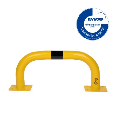 Metāla aizsargbarjera – dzeltena (RAL 1023) ar melnām atstarojošām joslām. Cinkota un krāsota. Piemērota izmantošanai ārā. Izmēri: platums 750mm, augstums 350mm, metāla biezums 3,2mm. Caurules diametrs – 76mm. Barjera izgatavota ar lieces tehnoloģiju – bez metinājuma šuvēm. Pamatnes izmērs: 120x195mm. Stiprināšana pie zemes ar 8 skrūvēm d=12,5mm (nav iekļautas komplektā!). TÜV sertifikāts. Svars: 8,5kg.