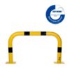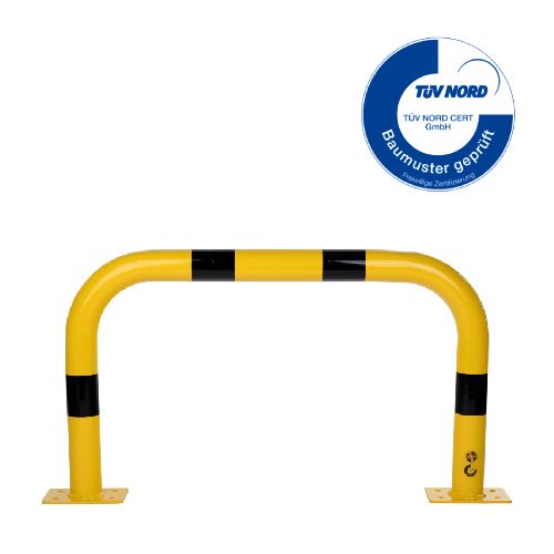 Metāla aizsargbarjera – dzeltena (RAL 1023) ar melnām atstarojošām joslām. Cinkota un krāsota. Piemērota izmantošanai ārā. Izmēri: platums 1000mm, augstums 600mm, metāla biezums 3,2mm. Caurules diametrs – 76mm. Barjera izgatavota ar lieces tehnoloģiju – bez metinājuma šuvēm. Pamatnes izmērs: 120x195mm. Stiprināšana pie zemes ar 8 skrūvēm d=12,5mm (nav iekļautas komplektā!). TÜV sertifikāts. Svars: 13kg.