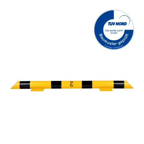 Metāla aizsargbarjera – dzeltena (RAL 1023) ar melnām atstarojošām joslām. Cinkota un krāsota. Piemērota izmantošanai ārā. Izmēri: garums 1200mm, augstums 76mm, metāla biezums 3,2mm. Caurules diametrs – 76mm. Pamatnes izmērs: 120x195mm. Stiprināšana pie zemes ar 8 skrūvēm d=12,5mm (nav iekļautas komplektā!). TÜV sertifikāts. Svars: 8,9kg.