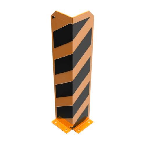 Metāla aizsargbarjera (L-tipa) – oranži dzeltena ar melnām atstarojošām joslām. Krāsota dzeltena, ar melnu līmplēvi. Piemērota izmantošanai iekštelpās. Izmēri: garums uz abām pusēm 160mm, augstums 800mm, metāla biezums 5mm. Stiprināšana pie zemes ar 4 skrūvēm (nav iekļautas komplektā!). Svars: 10.5kg.