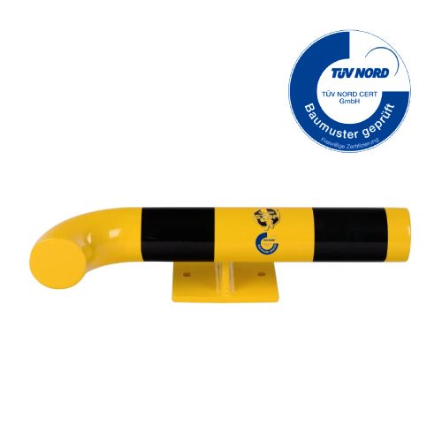 Metāla aizsargbarjeras iekšējais stūris (kreisā puse). Krāsa: dzeltena (RAL 1023) ar melnām atstarojošām joslām. Cinkots un krāsots. Piemērota izmantošanai ārā. Izmēri: garums 500mm, augstums 140mm. Caurules diametrs – 76mm. Pamatnes izmērs: 120x195x6mm. Stiprināšana pie zemes ar 4 skrūvēm d=12,5mm (nav iekļautas komplektā!). TÜV sertifikāts. Svars: 5,6kg.