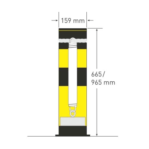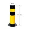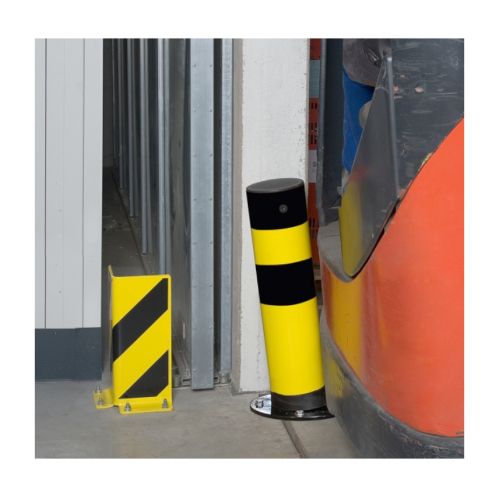 Metāla aizsargstabs (ar spirālveida atsperi). Krāsots dzeltenmelns. Elastīgs. Stabs noliecas maksimāli līdz 25 grādiem un automātiski atgriežas sākuma pozīcijā. Stiprināms pie pamatnes ar 4 skrūvēm (komplektā nav iekļautas!). Izmēri: staba d=159mm, h=965mm, staba materiāla biezums 4.5mm, pamata plāksnes izmērs d=270mm. Pielietojams iekštelpās (nav cinkots). Svars: 26kg. Atsevišķi var iegādāties iebetonējamu metāla pēdu.