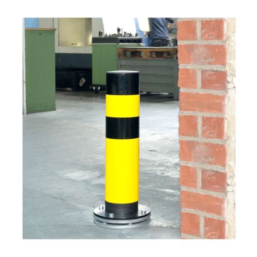 Metāla aizsargstabs, rotējošs (tērauda pamatplāksne ar 6 lodīšu gultņiem). Krāsots dzeltenmelns. Elastīgs. Stabs noliecas maksimāli līdz 25 grādiem un automātiski atgriežas sākuma pozīcijā. Stiprināms pie pamatnes ar 4 skrūvēm (komplektā nav iekļautas!). Izmēri: staba d=159mm, h=700mm, staba materiāla biezums 4.5mm, pamata plāksnes izmērs d=270mm. Pielietojams iekštelpās (nav cinkots). Svars: 36kg. Atsevišķi var iegādāties iebetonējamu metāla pēdu.