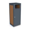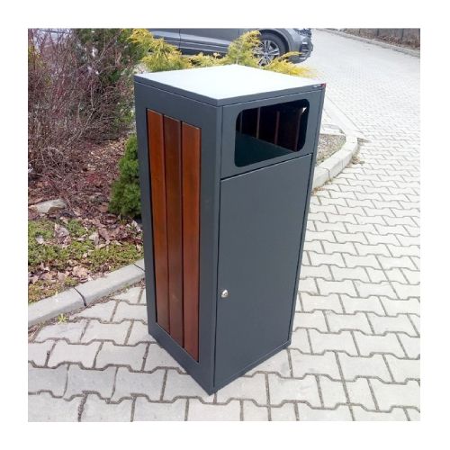 Metāla atkritumu tvertne ar koka elementiem. Tilpums: 120l. Izmēri: platums 450mm, dziļums 440mm, augstums 1100mm. Izgatavota no 1mm tērauda lokšņu materiāla. Viegla atkritumu iztukšošana (no sāna). Cinkota un krāsota RAL 7021 tonī (pieejamie toņi: melna RAL 9005; grafīta pelēka RAL 7021; sudraba pelēka RAL 9006; pelēka RAL 9007; brūna RAL 8011; dzeltena RAL 1023; zaļa RAL 6018; sarkana RAL 3002; oranža RAL 2000). Pieejams arī nerūsējošā tērauda variants. Koka dēlīšu pieejamie toņi: gaišs ozols vai palisandrs (tumšs). Piemērota parkos, skvēros, māju pagalmos, autobusu pieturās, gājēju celiņu malās u.c.