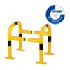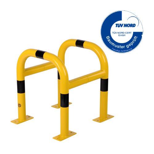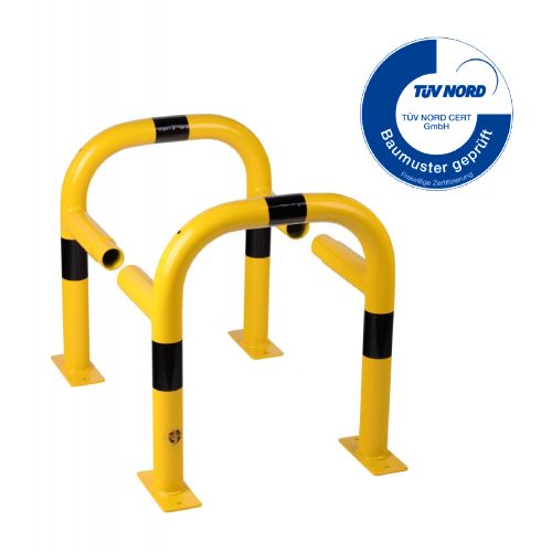 Metāla kvadrātveida aizsargbarjera – dzeltena (RAL 1023) ar melnām atstarojošām joslām. Cinkota un krāsota. Piemērota izmantošanai ārā. Izmēri: platums 520mm, augstums 600mm. Divdaļīgi savienojama. Paredzēta max. 400x400mm kolonnas vai staba aizsardzībai. Pamatnes izmērs: 160x70mm. Stiprināšana pie zemes ar 8 skrūvēm d=12,5mm (nav iekļautas komplektā!). TÜV sertifikāts. Svars: 16,6kg.