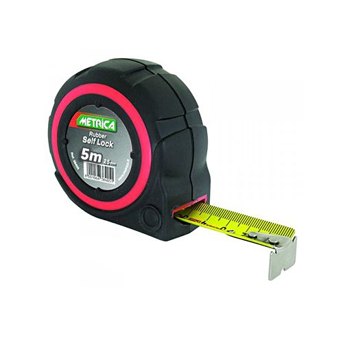 Metāla mērlenta ar neilona pārklājumu un gumijas korpusu. Pašfiksējoša. Automātiska attīšanas poga. Izmēri: garums 5m, lentas platums 25mm.