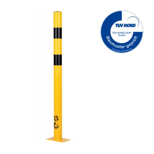 Metāla stabiņš – dzeltens (RAL 1023) ar melnām atstarojošām joslām. Cinkots un krāsots. Piemērots izmantošanai ārā. Izmēri: augstums 1200mm, metāla biezums 3,2mm. Caurules diametrs – 76mm. Pamatnes izmērs: 120x195mm. Stiprināšana pie zemes ar 4 skrūvēm d=12,5mm (nav iekļautas komplektā!). TÜV sertifikāts. Svars: 8,3kg.