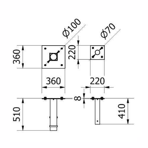Metāla stiprinājumu komplekts (2gab.) ievietošanai betonā (ar iekļautām skrūvēm). Piemērots H5 tipa paceļamajām barjerām galvenā un atbalsta staba iebetonēšanai. Izmēri: galvenā staba stiprinājuma garums 360mm, platums 360mm, augstums 510mm, biezums 8mm, iekšējās caurules d=100mm; atbalsta staba stiprinājuma garums 220mm, platums 220mm, augstums 410mm, biezums 8mm, iekšējās caurules d=70mm. Izgatavots no karsti cinkota tērauda. Komplektā ar M16 skrūvēm (4gab.). Svars: 12kg.