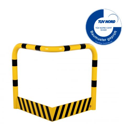 Metāla stūru aizsargbarjera – dzeltena (RAL 1023) ar melnām atstarojošām joslām. Cinkota un krāsota. Piemērota izmantošanai ārā. Izmēri: platums uz abām pusēm 900mm, augstums 1000mm, apakšējā aizsarga augstums 200mm, metāla biezums 3,2mm. Caurules diametrs – 76mm. Barjera izgatavota ar lieces tehnoloģiju – bez metinājuma šuvēm. Pamatnes izmērs: 120x195mm. Stiprināšana pie zemes ar 12 skrūvēm d=12,5mm (nav iekļautas komplektā!). TÜV sertifikāts. Svars: 40kg.