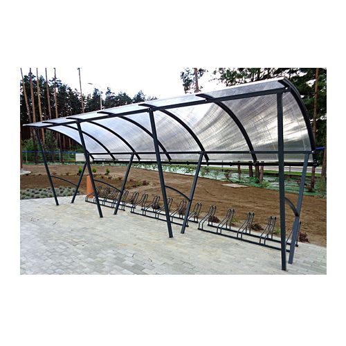 Nojume 15 velosipēdu novietošanai. Izmēri: platums 630cm, dziļums 210cm, augstums 240cm. Jumta seguma materiāls: polikarbnāts 8mm. Atbalsta struktūra: 50x50x2mm cinkota tērauda profili. Jumta struktūra: 50x30x2mm cinkota tērauda profili. Iespējams ievietot piecvietīgu velosipēdu statīvu HARRY, ADAM, ORTAL vai U-veida. Par papildus samaksu iespējams krāsot kādā no RAL krāsām.