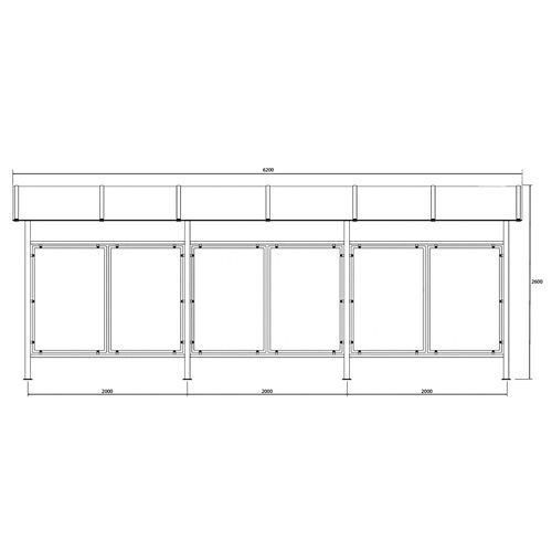 Nojume 15 velosipēdu novietošanai. Izmēri: platums 630cm, dziļums 230cm, augstums 260cm. Jumta seguma materiāls: polikarbnāts 8mm. Atbalsta struktūra: 50x50x2mm cinkota tērauda profili. Jumta struktūra: 50x30x2mm cinkota tērauda profili. Iespējams ievietot piecvietīgu velosipēdu statīvu HARRY, ADAM, ORTAL vai U-veida. Par papildus samaksu iespējams krāsot kādā no RAL krāsām.