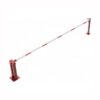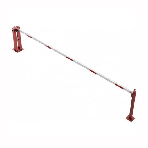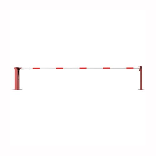 Paceļama barjera ar pneimatisko atsperi un fiksētu atbalsta stabu. Atvēršana/aizslēgšana ar euro-profila cilindra slēdzeni (pieejama arī ar piekaramo atslēgu vai trijstūrveida slēdzeni). Stiprināma pie pamatnes ar skrūvēm (iespējams arī iebetonēt – papildus nepieciešams betonējamie enkuri: 360x360x8mm un 220x220x8mm). Ieteicamie betona pamata izmēri galvenajam vertikālajam stabam 550x550x900mm; atbalsta stabam – 400x400x900mm. Izmēri: kopējais platums = 5000mm + 180mm, vidējais (brīvais) platums 5000mm, vertikālais galvenais stabs no 120x80mm tērauda caurules (karsti cinkots un krāsots sarkans), atbalsta stabs no tērauda caurules 70x70mm ar pamatnes plāksni 220x220x8mm, horizontālā barjera (alumīnija caurule ar biezām sieniņām) d=80mm, balta ar sarkanām atstarojošām joslām, augstums virs zemes 950mm. Bloķēšanas mehānisms: pie atbalsta staba, horizontālo stabu var fiksēt atvērtā un slēgtā stāvoklī. Iespējams papildus iegādāties atbalsta kāju enkurus montāžai betonā ar skrūvēm un metāla trosi. Svars: 60kg.