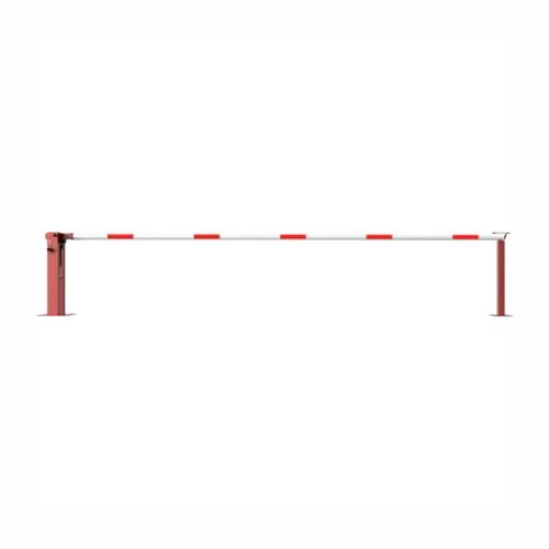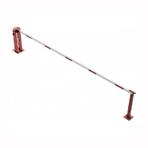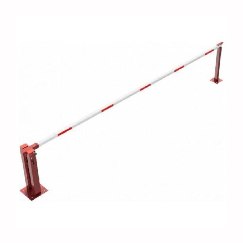 Paceļama barjera ar pneimatisko atsperi un fiksētu atbalsta stabu. Ar trīsstūrveida slēdzeni un Euro profila cilindra slēdzeni pie galvenā balsta. Barjera pieejama arī ar piekaramo atslēgu, eiro-profila cilindra slēdzeni un trijstūrveida slēdzeni. Stiprināma pie pamatnes ar skrūvēm (iespējams arī iebetonēt – papildus nepieciešams betonējamie enkuri: 360x360x8mm un 220x220x8mm). Ieteicamie betona pamata izmēri galvenajam vertikālajam stabam 550x550x900mm; atbalsta stabam – 400x400x900mm. Izmēri: kopējais platums = 5000mm + 180mm, vidējais (brīvais) platums 5000mm, vertikālais galvenais stabs no 120x80mm tērauda caurules (karsti cinkots un krāsots sarkans), atbalsta stabs no tērauda caurules 70x70mm ar pamatnes plāksni 220x220x8mm, horizontālā barjera (alumīnija caurule ar biezām sieniņām) d=80mm, balta ar sarkanām atstarojošām joslām, augstums virs zemes 950mm. Bloķēšanas mehānisms: pie atbalsta staba, horizontālo stabu var fiksēt atvērtā un slēgtā stāvoklī. Iespējams papildus iegādāties atbalsta kāju enkurus montāžai betonā ar skrūvēm un metāla trosi. Svars: 60kg.