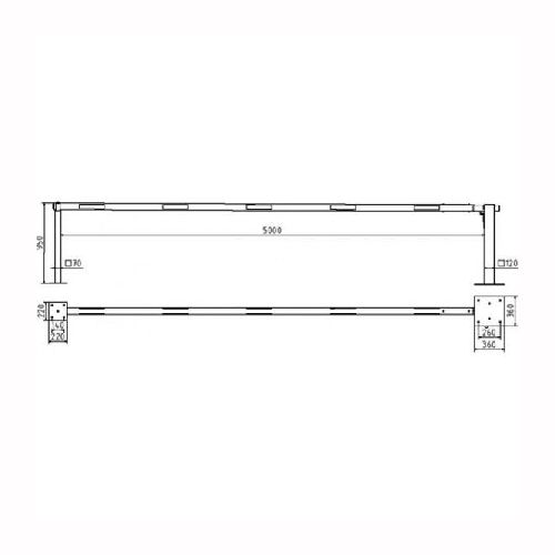 Paceļama barjera ar pneimatisko atsperi un fiksētu atbalsta stabu. Atvēršana/aizslēgšana ar piekaramo atslēgu (pieejama arī ar trijstūrveida slēdzeni vai euro-profila cilindra slēdzeni). Stiprināma pie pamatnes ar skrūvēm (iespējams arī iebetonēt – papildus nepieciešams betonējamie enkuri: 360x360x8mm un 220x220x8mm). Ieteicamie betona pamata izmēri galvenajam vertikālajam stabam 550x550x900mm; atbalsta stabam – 400x400x900mm. Izmēri: kopējais platums = 5000mm + 180mm, vidējais (brīvais) platums 5000mm, vertikālais galvenais stabs no 120x80mm tērauda caurules (karsti cinkots un krāsots sarkans), atbalsta stabs no tērauda caurules 70x70mm ar pamatnes plāksni 220x220x8mm, horizontālā barjera (alumīnija caurule ar biezām sieniņām) d=80mm, balta ar sarkanām atstarojošām joslām, augstums virs zemes 950mm. Bloķēšanas mehānisms: pie atbalsta staba, horizontālo stabu var fiksēt atvērtā un slēgtā stāvoklī. Iespējams papildus iegādāties atbalsta kāju enkurus montāžai betonā ar skrūvēm un metāla trosi. Svars: 54kg.
