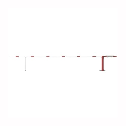 Paceļama barjera ar pretsvaru, ar atbalsta kāju. Atvēršana/aizslēgšana ar piekaramo atslēgu (pieejama arī ar trijstūrveida slēdzeni vai euro-profila cilindra slēdzeni). Stiprināma pie pamatnes ar skrūvēm (iespējams arī iebetonēt – papildus nepieciešama betonējamais enkurs balstam 360x360x8mm). Ieteicamie betona pamata izmēri galvenajam vertikālajam stabam 550x550x900mm. Izmēri: kopējais platums = 6000mm + 900mm, vidējais (brīvais) platums 6000mm, vertikālais stabs (karsti cinkots un krāsots sarkans), atbalsta stabs no alumīnija, horizontālā barjera (alumīnija caurule ar biezām sieniņām) d=80mm, balta ar sarkanām joslām, augstums virs zemes 950mm. Bloķēšanas mehānisms: pie galvenā atbalsta staba bloķēšanas tapa, horizontālās barjeras nostiprināšanai atvērtā vai slēgta pozīcija. Iespējams papildus iegādāties atbalsta kāju enkuru montāžai betonā un metāla trosi. Svars: 117kg.