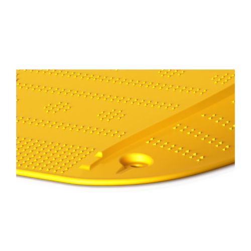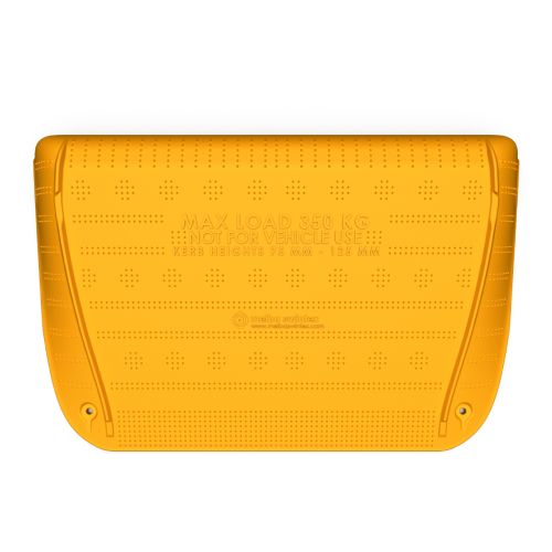 Pagaidu PVC uzbrauktuve (rampa), dzeltena. Izmēri: garums 1199mm, platums 766mm, augstums 123mm. Var uzstādīt rampu uz min. 75mm, max. 125mm augstumā. Pretslīdoša virsma. Iztur slodzi līdz 350kg. Augsta triecienizturība. Pārstrādājama. Izgatavota no augsta blīvuma polietilēna un PVC materiāla. Svars: 13.2kg.
